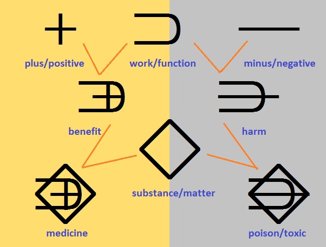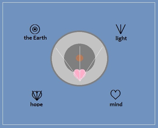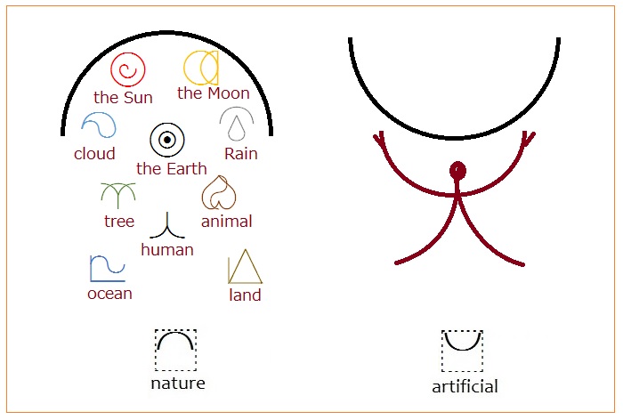 2) Everyone got surprised to know that a personal unconscious action, such as touching his eyes, mouth or nose, could have an influence on the society, and the speed to link from one to the whole planet. 3) As a result of anti-virus measures such as prohibition of physical large gatherings and movement of people over an area, closure of schools, workplaces, stores and isolation, a lot of people newly experienced teleworking and telemeeting. A big revolution to new ways of working, ways of living, ways of linking and ways of spending time by using Cyberspace seems to have happened. The technology must speed up even more to continue to support it. From these three cases, don’t you hear the starting sound of growing a ring of humans hand in hand equally as earthians across an area, to bring true democracy? I feel it’s like a gate to connect to the ideal society which I’ve imagined so far. Long ago, the elderlies were rare and respected from youth, but now their population is increasing more and more. There is a technological gap between these generations, too. So the elderlies and invalids are regarded as economical burdens in the society where competing efficiently is the goal. However there is the wisdom that would not be available without experiencing sickness or aging coming close to death. I can’t follow a youth at memory and speed. But it’s hard to capture the total view and the most important point while running around; we can do it better from far away and in slow motion. Now a days, many seniors can’t follow the modern technology and don’t speak out about their thoughts. But I feel a responsibility to talk about it while I’m still alive, and to leave my opinion to you from such a viewpoint. So, could you listen to me about the ideal world of the future? It is not a mere dreamlike story. It’s about the future that I looked at with a magical method. It is a tool to think about by dividing and connecting things from the root; and called "Earth Language." If the structure of the world is warped, it could be faster after all to reconsider it from the root than taking an emergency measure without any overall plan. Would you like to try to look into the future with me at this opportunity to know why this method works like magic? In a word, EL is a new method to organize information and to mediate thought and transmission among humans. The name includes “language,” but it’s not a vocal language; and it’s based on "form." A simple form symbolizes a fundamental element of people or nature. Then you can express a new thing by overlaying symbols, and combining meanings of elements, or making the simplified picture. When you write a simple symbol with your finger to a blind person’s or your friend’s palm in the darkness, you can voicelessly inform something to them by the sense of touch. Also hand signs and gestures can show the symbol forms, too. In another way, if you pronounce a one-syllable name of a symbol, others can imagine what the symbol symbolizes. Therefore EL can help mutual understanding in most circumstances, such as cross-cultural conditions and physically different conditions as blindness and deafness, with a choice of indication method. Even though EL signs usually work as ideographs, we need to express just the sounds for such things as names, right? So, EL has its own phonetic system, too. It represents each sound scientifically, by sound-element bases overlay, separated from the definition system. Even it is a visual sign, there is a point resembling onomatopoeia a little. An EL sign was not just abstractly set up with its meaning. The form symbolizes the energy condition of the meaning, so that it gets on your eyes and body directly. For example, it’s easier to open up a jar when you turn the lid with onomatopoeia voice, "Ghup." When you write the EL bases overlay with “heart” and “light” in your mind, you feels some "Hope", imagining a light springs out in your heart. The power of the symbol might reflect it to the body. Because of such a structure, you need not memorize each sound of a word like learning foreign languages. Just handle it as Emoji while reading directly by your mother tongue. Is it Emoji? Hieroglyph? Is it primitive? You may say so. But this Emoji has the ability to change you into a philosopher, when you come to use it. Do you want to try it? Well, I’ll show you some sample to feel how this Emoji works for your thinking way. (3) Nature and artificial thing Though this tool is still developing, it uses 70 definition bases. Three of them are semicircle. Let’s see the world mainly through these 3 bases at first. See the explanation of the diagram, the form in the frame of the dotted line is a base. Every base fits into the inherent position in the same square frame, indication of the frame is not necessary for writing, though. EL can increase new symbols of various forms and meanings by putting plural bases on top of one another. The frame setting, even if it’s invisible, makes it systematically posible to create almost unlimited bases-overlay symbols. Though these three semicircle bases are totally the same shape, the facing direction and the position in the frame are different from each other, so the meanings of them are different, too. EL writing goes from the left to the right as the rule, so the direction of the form of a base is related to each meaning. [The base to represent "Nature"] The upper half circle attached to the frame symbolizes "nature." It looks like covering the whole universe, spreading the roots into invisible infinite depth. All of what you recognize are there in nature. [The base to represent "Artificial"] It has the vertically inverted form of the base,“nature” at the same location. This base symbolizes "human made condition as artificial, product, creation." It’s because humans turn materials and energy in nature into new things for their own convenience or will. Also this base for