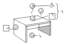 (日本語では「机の上」は、接しているいないを問いません。「上」の基礎記号のみで同様に表現できますが、図のように真上か接して置かれているか区別できます。この場合、正方形の記号は表面を意味します。)