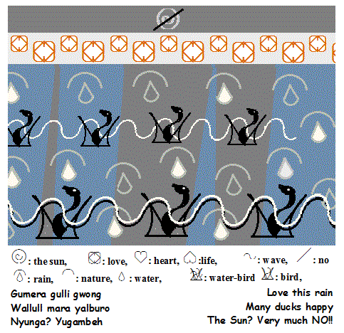 ユガンベというオーストラリア先住民のミュージアムサイトに彼らの言語の辞書が新設されたニュースを現地に住む地球語の友、ロビーさんが知らせてくださいました。早速辞典を拝見するとなんだか懐かしい!ワンワン、ごしごし的な擬音語のような繰り返し音の単語が含まれています。この文字絵は上のリンクにあるユガンベ俳句のために、お祝いとして作りました。雨が楽しくなる歌と思ったんですが・・・