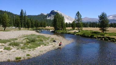 120号線でヨセミテを横切ると、森、花崗岩のドーム、湖、草原と、すばらしい景観が続きます。標高3000メートルを越える草原ではカンカン照りでもほどよい暑さ、小川のせせらぎは冷たく澄み切っています。ここの近くにぼこぼこと炭酸泉が湧き出ているところがあり、底は鉄分で真っ赤、天然ミネラルウォーター!手で掬って味わってみると、甘みがあり、ほんとにソーダ水のようでした。
