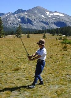 3500〜4000mの山の窪みには残雪が輝いています。小川沿いには、アンジェリカや野生のガーリックが咲き、春の香りを散らしているのに、松林の下では、なんと大きな茸がもこもこ頭をもたげています。たぶんカリフォルニアでマツタキと俗に呼ばれている松茸のそっくりさんではないかしら。指をくわえて通り過ぎました。ここでは春と秋が一緒にやってきてたちまちまた冬の雪に閉ざされてしまうのだとわかりました。写真は、私の太極剣の剣に大自然の気を吸わせているところです。