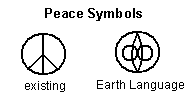 現行の平和のマーク(図の左)は「戦争止め!」の信号に由来します。しかし本当の平和とは全体が動きながらコマのように調和して回転が永く続く状態ではないでしょうか。地球語の「世界平和」はその組み合わせで表現します。戦争を止めるために、また経済手段として武器を世界中に拡散し続けている限り世界は不安を増し、人々は心の平和を得られません。地球語は、地球語マークのような構造の世界平和へのチェンジをもたらそうとしています。