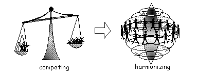 現在の経済危機は、勝ち負けの天秤とピラミッド型の社会構造で富と力を争ってきた結果です。持続可能な社会は、みんなが行動し協力と共感を集めて球体を構成する社会ではないでしょうか。