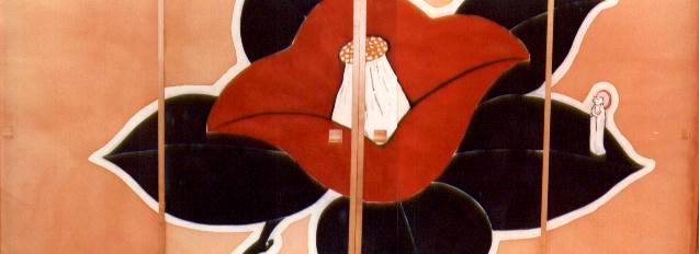 The sliding doors of a room: when they are opened, you see the real camellia